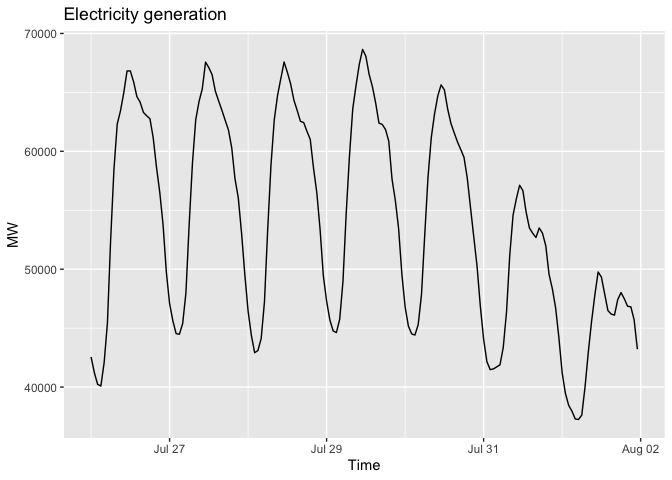 labs(x = "Time", y = "MW", title = "Electricity generation")